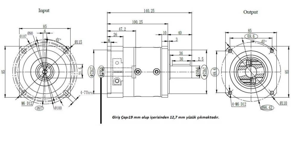 Redüktör Mil Girişi Çapı 19mm olup içinden 12,7 mm Çapa düşüren Pens (Yüzük) Çıkmaktadır. Nema 34 Motorlar İle Uyumlu yüksek hassasiyetlidir.