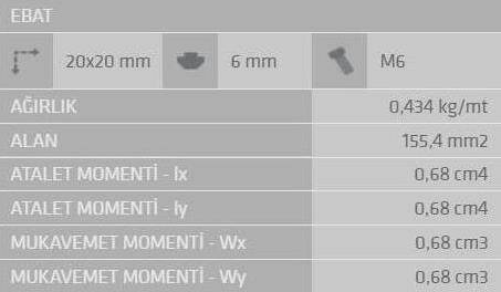 20X20 Sigma Profilin bükülme ve burulma direnci, yani atalet momenti (moment of inertia) değerleri, profilin kesit geometrisi ve kullanılan EN AW-6063 T5 alaşımının mekanik özelliklerine göre hesaplanır. Bu teknik değerler, projenizin statik ve dinamik yük hesaplamaları için kritik öneme sahiptir. Detaylı mühendislik verileri ve hesaplamalar için teknik ekibimizle iletişime geçebilirsiniz.