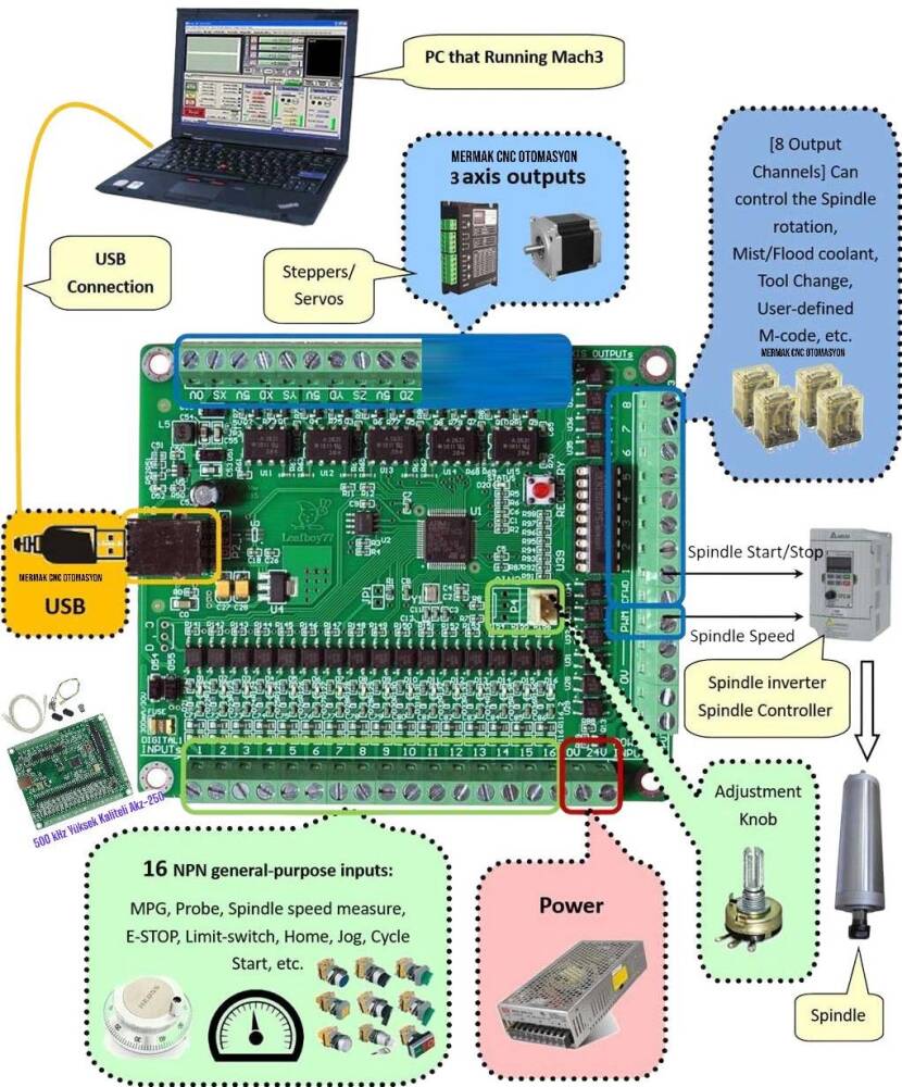 Kontrol kartı üzerinde CNC uygulamalarında ihtiyaç duyulacak bütün giriş, çıkış birimleri bulunmaktadır.