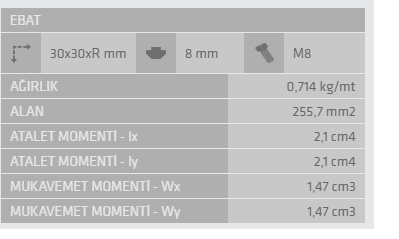 30X30Xr Sigma Profil 8 Kanal Toptan, 30x30mm kesit ve 8 kanallı yapısıyla endüstriyel uygulamalarda yüksek mukavemet sunar. Spesifik taşıma kapasitesi ve burulma dayanımı, uygulama şekline, bağlantı elemanlarına ve destek noktalarına göre değişmekle birlikte, tipik olarak orta ve ağır yük taşıyan makine iskeletleri, konveyör sistemleri ve otomasyon hücreleri için idealdir. Detaylı mühendislik hesaplamaları için profilin kesit verilerini kullanarak kendi analizlerinizi yapabilirsiniz.