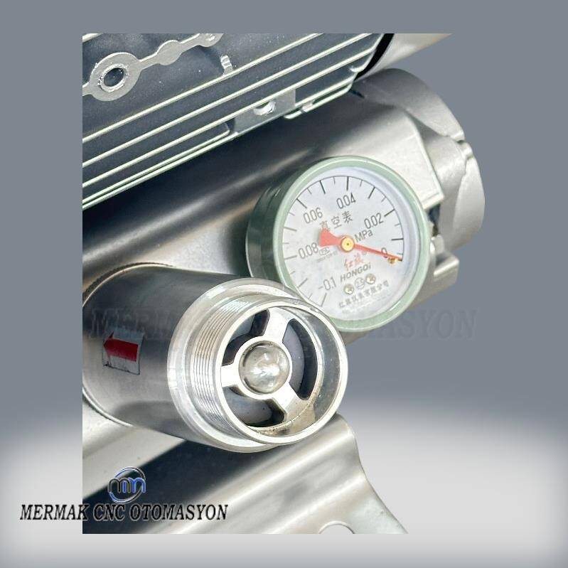 7.5 Kw Blower Vakum pompası 2100x2800 ile 2100x6000 Cnc Router Makinelerinde Denenmiş 18 mdf üzerinde 2 adet Mdf eklense dahi tümünü tutabilecek kapasiteye sahiptir. Ayrıca mdf lam kompozit alüminyum pvc gibi malzemelerde hava kaçağı olmadığı için tutma aşırı kuvvelidir. Emniyet valfi mevcuttur.