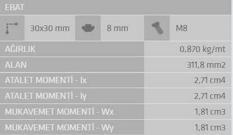 30x30 Sigma Profil 8 Kanal'ın metre ağırlığı ortalama olarak 0,870 Kg/Metre gelmektedir. Bu bilgi, projenizin toplam ağırlık hesabını yaparken size yardımcı olacaktır.