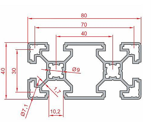 40X80 Sigma Profil 10 Kanal Hafif Tip ürünümüz, endüstriyel standartlara uygun T-kanallara sahiptir. Bu profil tipine uyumlu, 8mm kanal genişliğine sahip T-somunlar (örneğin M4, M5, M6, M8 civatalar için) ve diğer bağlantı elemanlarını rahatlıkla kullanabilirsiniz. 10mm'lik T-somunlar bu kanallar için geniş gelecektir.